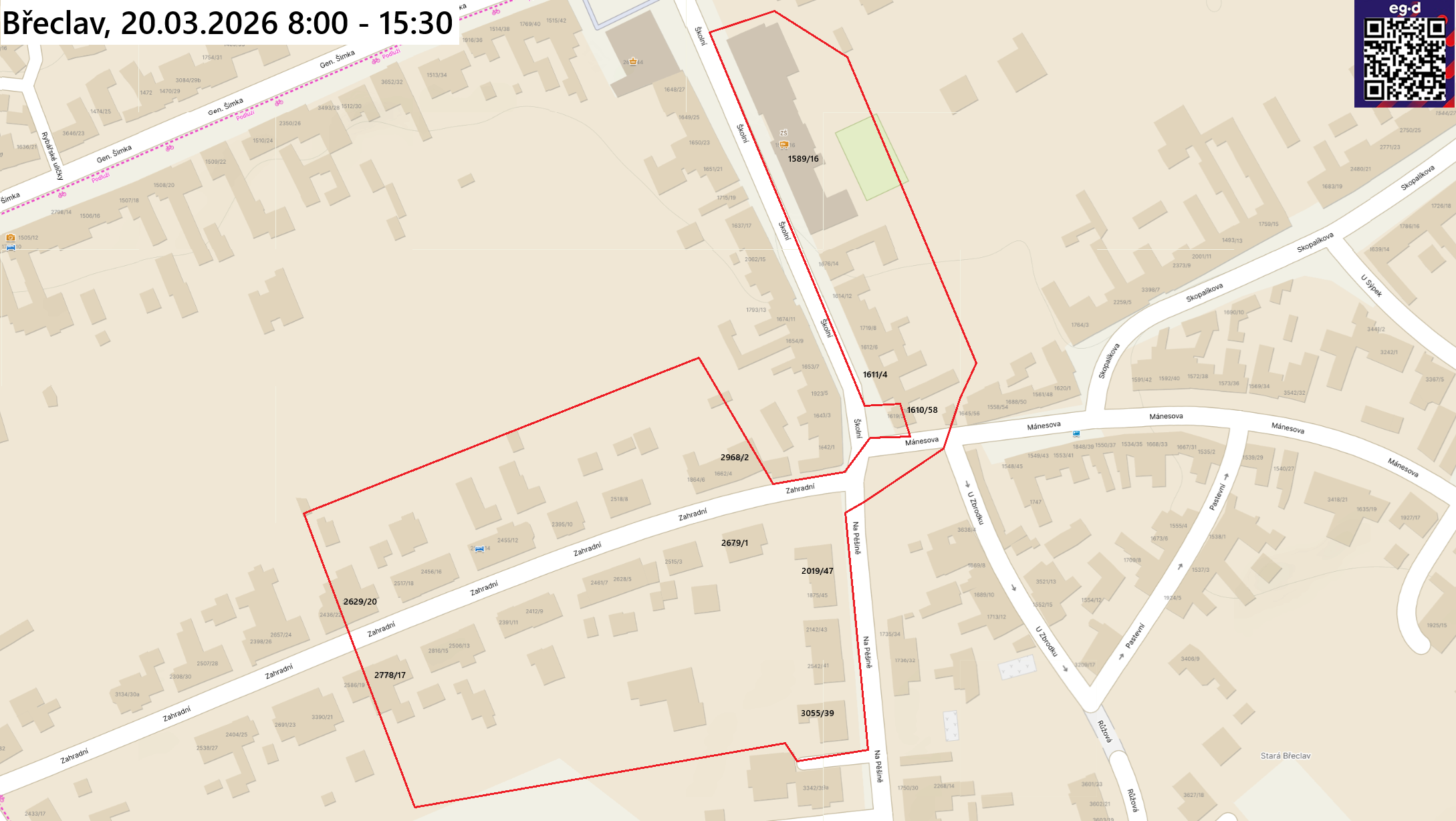 Oznámení o přerušení dodávky elektrické energie 20.3.2026 Břeclav, část ul. Zahradní, Na Pěšině, Mánesova a Školní