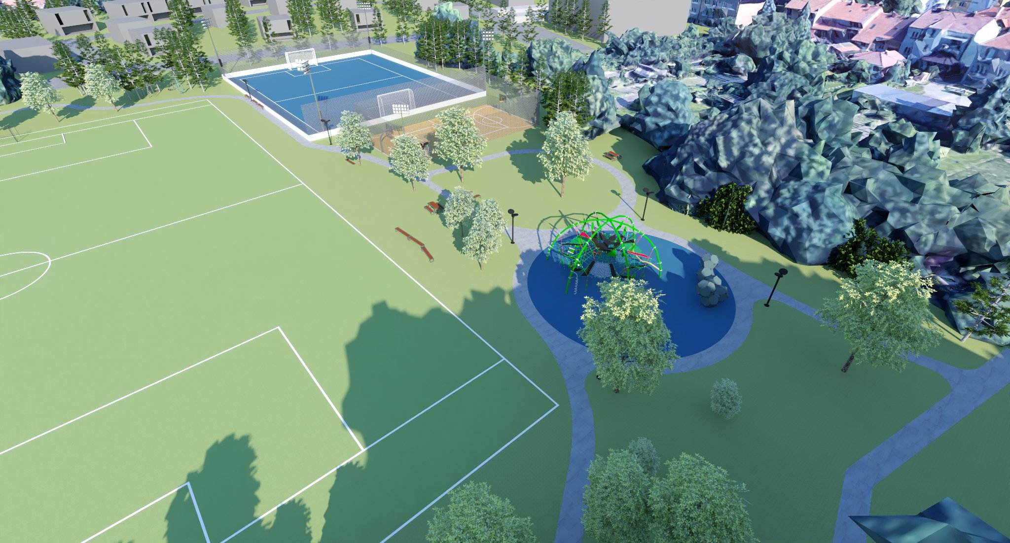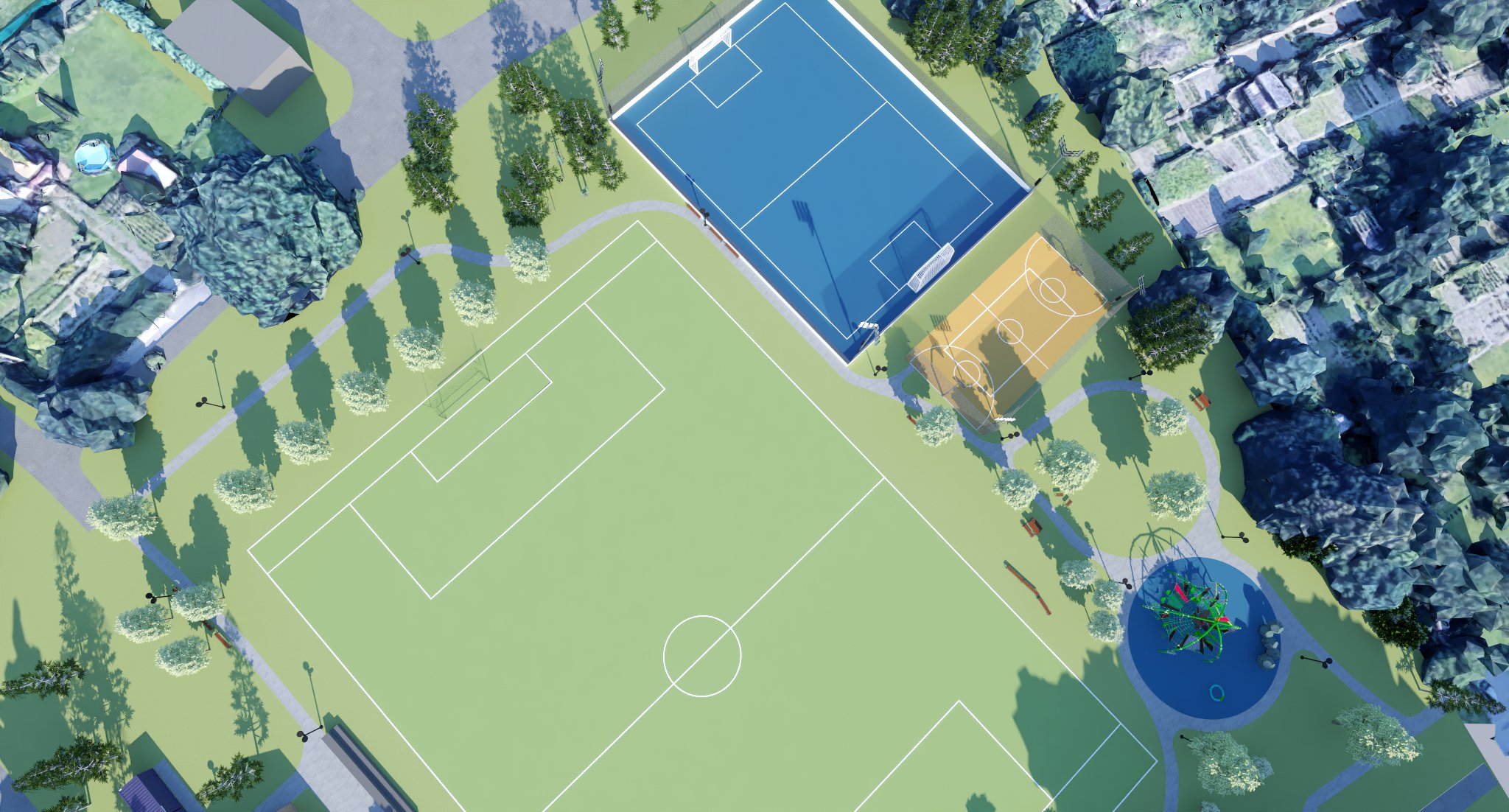 Větší hřiště o rozměru 50 x 38 m bude mít povrch z umělého trávníku a bude primárně určeno pro kopanou. Kolem hřiště budou mantinely i záchytné sítě. Druhé menší hřiště s rozměrem 28 x 15 m bude oploceno ze všech stran do výšky čtyř metrů. Toto sportoviště je určeno pro basketbal, volejbal a další palubové sporty.
