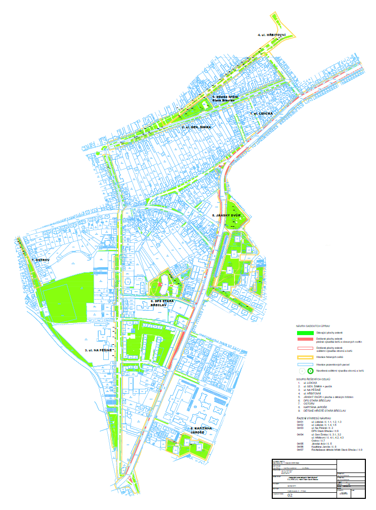 Koncept navrhovaných úprav byl postaven na výsadbě solitérních dřevin, keřů a stromů pro „ozelenění“ páteřní komunikace Lidická a ulic Generála Šimka, Na Pěšině, Hřbitovní, Jánský dvůr, DPS Stará Břeclav, Ostrov a Kpt. Jaroše. Cílem navrhovaných úprav v této oblasti byla snaha o umístění stromů nebo solitérních keřů na nejvhodnější místa.