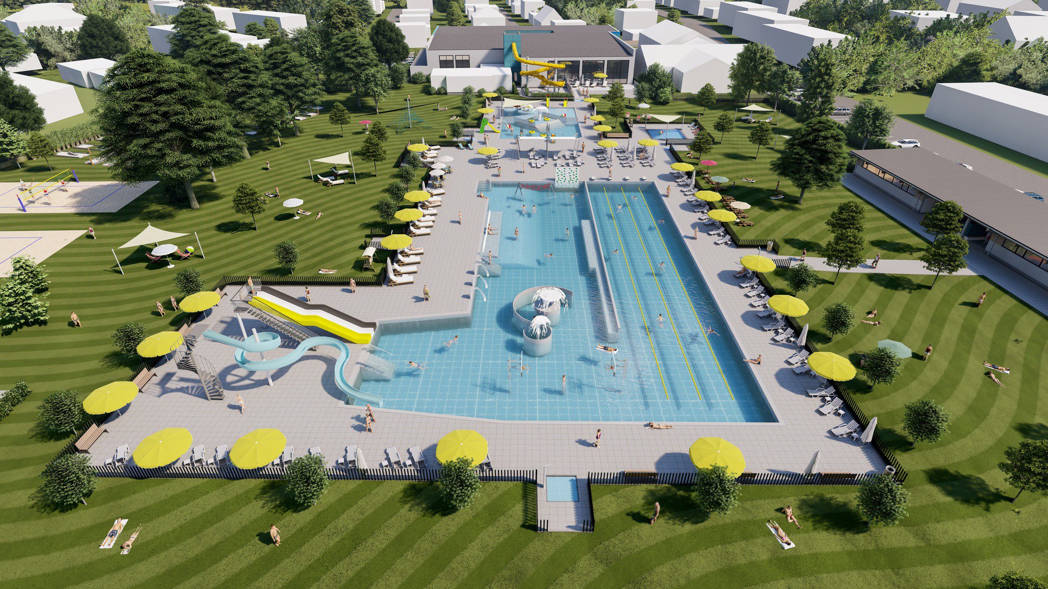Venkovní areál bude opatřen víceúčelovým bazénem, který bude rozdělen na plaveckou a neplaveckou část. Bazén bude z nerezu. Kolem bazénu bude travnatá plocha pro slunění návštěvníků. Ve víceúčelovém bazénu se budou nacházet 4 plavecké dráhy, dále zde budou umístěny atrakce jako tobogán, tří-dráhová skluzavka, šplhací síť, lanový most s lekníny, lezecká stěna, masážní trubkové lavice, masážní trubková pololehátka, masážní trubková lehátka, masážní trysky, masáže nohou, vodní stěna, perličky, chrliče, vodní děla, basketbalové koše, houpací záliv, vodní číše. V neplavecké části se nachází také dojezd pro tobogán a skluzavku. Pro vstup do bazénu je navrženo vstupní zařízení pro osoby ZTP - hydraulický bazénový zvedák.